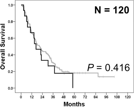 Figure 2: Overall survival according to PIK3CA mutation status in cohort 2. In cohort 2, overall survival was not significantly different between patients with PIK3CA-mutant tumors (black) and those with PIK3CA wild-type tumors (gray) (p = 0.416).