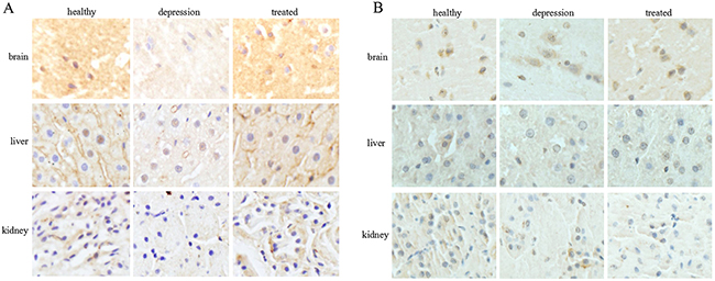 Figure 2: Expression and localization of TPH1/2 in rat tissues. The expression and localization of TPH1 (A) and TPH2 (B) were analyzed by immunohistochemistry in the rat brain, liver, and kidney of the healthy, depressive model, and treated groups. The images are representative of six independent experiments.