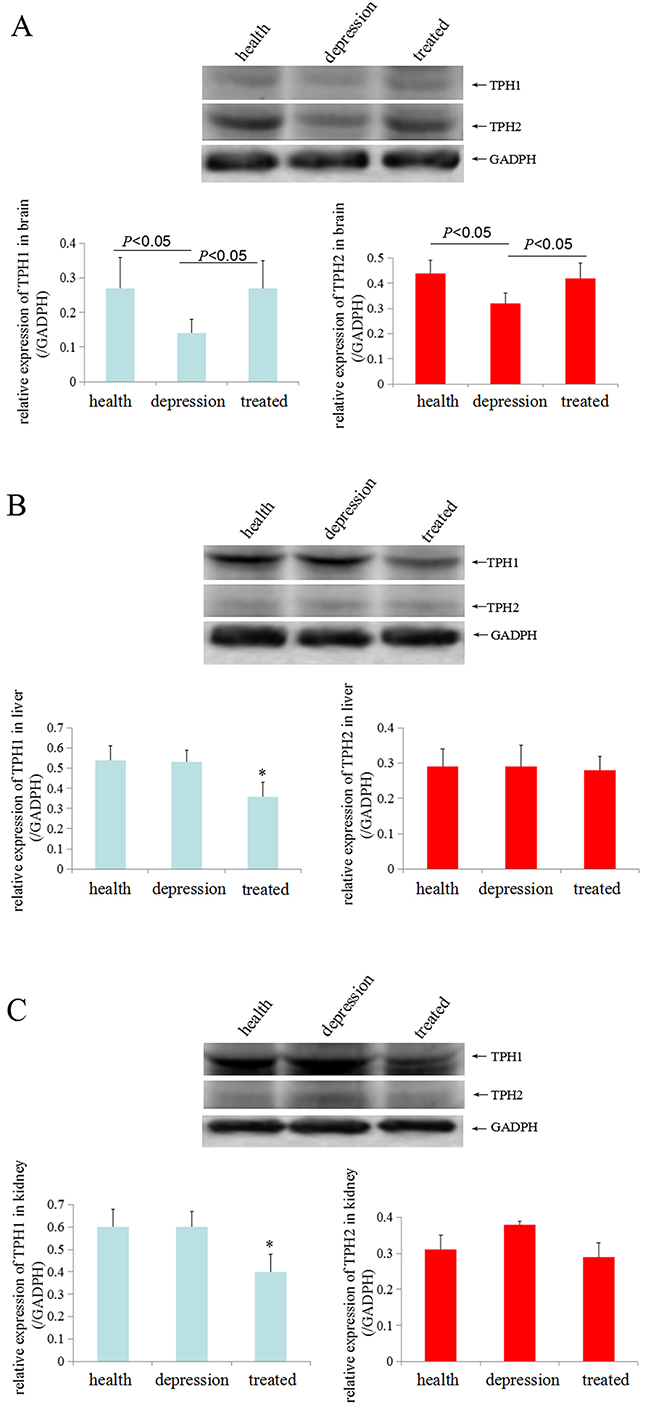 Figure 3: TPH1/2 expression in rat tissues. TPH1/2 expression in the brain (A), liver (B) and kidney tissues (C) from the healthy, depressive model and treated rats was detected by Western blotting. GAPDH (glyceraldehyde-3-phosphate dehydrogenase, a housekeeping gene that is stably expressed in all tissues) was used as an internal control. The images are representative of six independent experiments. *P<0.05 vs healthy and depressive model groups.