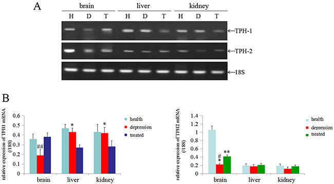 Figure 4: Expression of the TPH1/2 mRNAs in rat tissues. (A) RT-PCR analyses were used to measure the expression of the TPH1/2 mRNAs in the brain, liver and kidney of healthy, depressive modeland treated rats; 18S was used as an internal control. (B) The relative quantity of TPH1/2 mRNAs from RT-PCR (from the images shown in A), ##P<0.01 vs healthy and treated groups, *P<0.05 vs treated group, **P<0.01 vs healthy group, #P<0.01 vs healthy group. H: Healthy rats; D: depressive model rats; T: depressive model rats treated with paroxetine. The images are representative of six independent experiments.