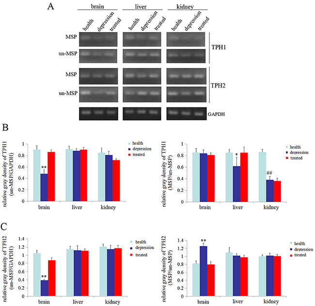 Figure 5: Methylation status of the TPH1/2 genes in rats. (A) Methylation-specific polymerase chain reaction (MSP) was used to assess the methylation status of the TPH1/2 genes in the brain, liver, and kidney of healthy, depressive model and treated rats; GAPDH was used as an internal control. Relativequantity of TPH1 (from the images shown in A ) (B) and TPH2 (from the images shown in A) (C) Un-MSP: un-methylated-specificPCR, MSP: methylated-specificPCR. **P<0.01 vs healthy and treated groups, ##P<0.01 vs healthy groups. The images are representative of six independent experiments.