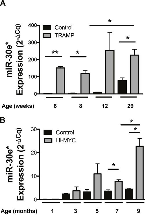 Figure 1: miR-30e* expression is elevated in CaP. (A) Whole prostates were harvested from TRAMP mice at 6-, 8-, 12 and 29-weeks of age and corresponding age matched control C57BL/6J mice (n = 3). (B) Prostates were also harvested from Hi-MYC mice along with wild type FVB age matched control mice (n = 2). Prostates were analyzed for miR-30e* and U6 snRNA expression via qRT-PCR. Raw data was analyzed and displayed in graph using the 2-dCq formula. Welch’s t-test (A) and Student t-tests were performed (B), Error bars represent SEM; * P ≤ 0.05, ** P ≤ 0.01.