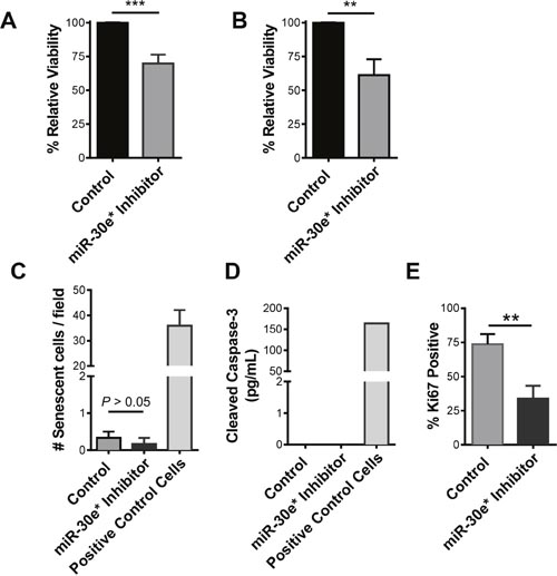 Inhibition of miR-30e* reduced the viability of TRAMP C2H tumor cells, a cell line derived from the TRAMP model (Figure 2A; ****P ≤ 0.001). Similar results were observed when miR-30e* was inhibited in the human CaP cell line PC3M (Figure 2B; day 1: **P ≤ 0.01 and day 2: *P ≤ 0.05). Confirmation of miR-30e* inhibition was performed in both TRAMP C2H and PC3M cells (Supplementary Figure 1A & 1B; *P ≤ 0.05 ***P ≤ 0.001). To determine how miR-30e* regulated CaP cell viability, the effects of miR-30e* inhibition on cell senescence, death and proliferation were tested. Inhibition of miR-30e* had no effect on the expression of senescence-associated β-galactosidase (Figure 2C; *P > 0.05) or cleaved caspase-3 (Figure 2D; *P > 0.05) suggesting that miR-30e* is not altering cell viability by inhibiting the percentage of cells that enter senescence or altering the rate of apoptotic cell death. miR-30e* inhibition did however significantly reduce the percentage Ki67 expressing cells (Figure 2E; **P ≤ 0.01) suggesting that the decrease in the cell viability following miR-30e* inhibition (Figure 2A & 2B) was due in part to a reduction in proliferation.