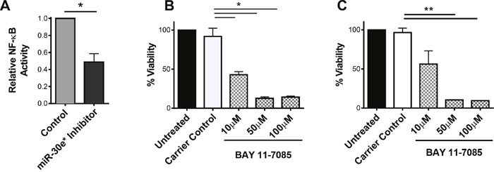 Figure 3: miR-30e* regulates NF-κB activity which is essential for prostate cancer cell viability. (A) To evaluate NF-κB activation, an NF-κB luciferase reporter construct was transfected into C2H cells. Luciferase was then evaluated in control and miR-30e* inhibited cells 24 hours post inhibition. Results are depicted as NF-κB activity relative to control experimental group. Welch’s t-tests were performed, error bars represent SEM; n = 4, * P ≤ 0.05. To assess whether NF-κB regulates prostate cancer viability TRAMP C2H (B) and PC3M (C) cell viability was assessed following a 24 hour treatment with 10 μM, 50 μM and 100 μM Bay 11-7085 treatment via MTT analysis. Equal volume ethanol carrier was used as a control. Welch’s t-tests were performed, error bars represent SEM, n = 3, *P ≤ 0.05 and **P ≤ 0.01.