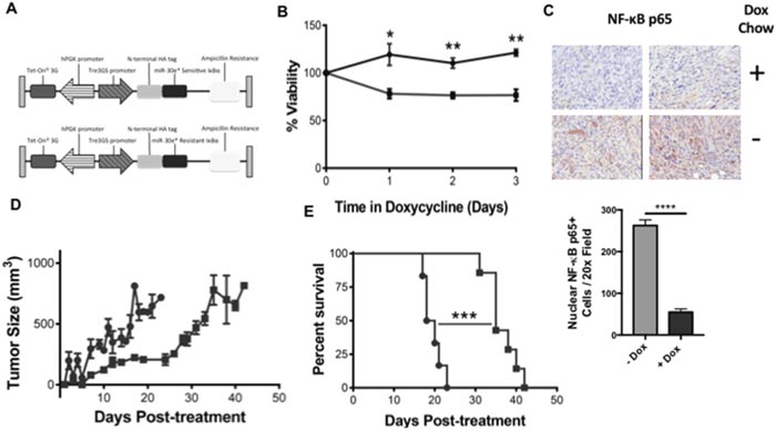 Figure 4: miR-30e* regulates prostate cancer cell proliferation and tumor growth through IκBα. (A) Plasmid maps for doxycycline inducible N-terminal HA tagged miR-30e* sensitive IκBα and miR-30e* resistant IκBα pTetOne plasmids. (B) To evaluate whether the miR-30e*: IκBα interaction regulates CaP cell proliferation, C2H cells were transfected with a doxycycline inducible vector that expresses either miR-30e* sensitive or resistant IκBα. Cell viability was assessed in both miR-30e* sensitive (●) and resistant (■) clones following stimulation with 100 ng/mL doxycycline hyclate via MTT assay. Results are depicted as fold change relative cells not treated with doxycycline. Welch’s t-tests were performed, error bars represent SEM; n ≥ 3,* P ≤ 0.05, ** P ≤0.01. To determine if the specific targeting of IκBα by miR-30e* regulated NF-κB p65 activation miR30e* resistant IκBα C2H cells were administered subcutaneously in C57BL/6 mice (C). Once the tumors reached 100mm3, mice were randomized and initiated on either dox chow or remained on control chow. Tumor were explanted once the tumor volume reached 800mm3 and nuclear NF-κB p65 was quantified via IHC. Five sections were quantified from each tumor (n=4, P ≤ 0.001). Normal (●) or doxycycline containing (■) chow tumors were monitored and tumor growth was assessed. Results are depicted as tumor growth (mm3) after doxycycline treatment (D) and percent survival (E). Welch’s t-tests were performed, error bars represent SEM; n ≥ 6, *** P ≤ 0.001.