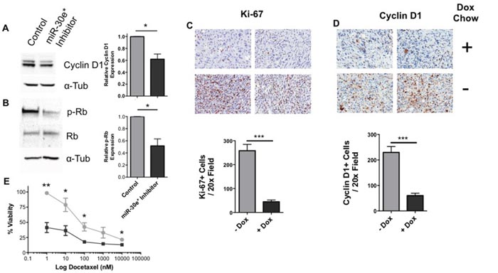 Figure 5: The miR-30e*: IκBα axis regulates cyclin D1 and proliferation in vivo. The expression of cyclin D1 (A) and Rb (total and phosphorylated) (B) were evaluated in C2H cells treated with or without miR-30e* inhibitor for 24h via western blot analysis. Representative blots are shown on the right; summary results are depicted as expression relative to control C2H cells. Welch’s t-tests were performed, error bars represent SEM; n ≥ 4, * P ≤ 0.05. To assess if miR-30e* regulates prostate cancer cell proliferation and the expression of cyclin D1 in vivo IHC was performed. miR30e* resistant IκBα C2H cells were administered subcutaneously in C57BL/6 mice. When the tumors had established and reached 100mm3, normal (●) or doxycycline containing (■) chow was administered, tumors were harvested, formalin fixed and stained for Ki-67 (C) and cyclin D1 (D) when they reached 800 mm3. Images (C-D) represent IHC staining from 2x representative tumors from both normal and doxyxline chow fed mice and are displayed at 20x. (E) C2H cells were treated with either docetaxel alone (●) or in combination with miR-30e* inhibitor (■) and viability was assessed via MTT assays. Results are depicted as % viable (absorbance value of experimental relative to untreated TRAMP C2H cells). Welch’s t-tests were performed, error bars represent SEM; n = 4, * P ≤ 0.05, ** P ≤ 0.01.