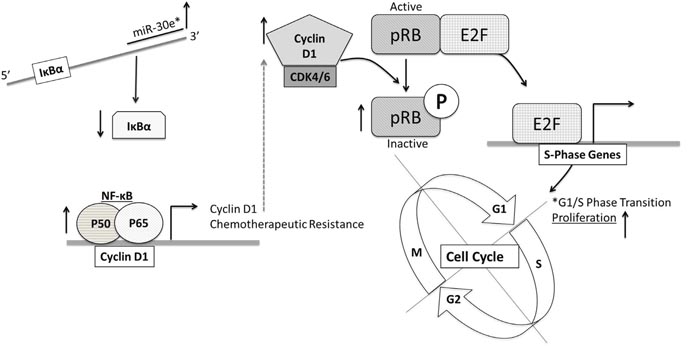 Figure 6: The microRNA-30e*: NF-κB axis regulates prostate cancer cell proliferation and therapeutic resistance. miR-30e* targets IκBα mRNA thus increasing NF-κB activation. NF-κB drives chemotherapeutic resistance and also increases cyclin D1 production. Cyclin D1:CDK4/6 phosphorylates pRb allowing it to dissociate from E2F. Free E2F pushes CaP cells from G1 to S phase and drives proliferation and therapeutic resistance.
