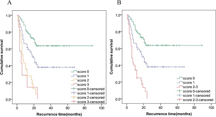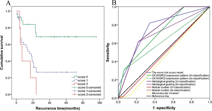 Most HCC patients could be detected at early stages using imaging technology. With the application of MC or Barcelona Clinic Liver Cancer (BCLC) staging system [17], the tumor recurrence rates after liver transplantation (LT) or RR was significantly reduced. LT has been proved to be the optimal therapy for HCC patients at early stage, but due to the shortage of liver donors, patients choose RR. Therefore, discriminating the patients with high risk of recurrence and establishing a set of optimal criteria for early stage HCC patients are crucial. In the present study, 198 HCC patients who received RR and conformed to MC were investigated. Regression analysis showed that three risk factors including CK19/GPC3 expression pattern, histological grading and multiple tumors were regarded as the independent predictors for HCC recurrence. Results of the Cox regression devised a risk predicting model which sub-classified HCC patients into high, intermediate and low risk groups. Overall results indicated that the model can effectively stratify the risk of recurrence of HCC patients fulfilling MC after RR.