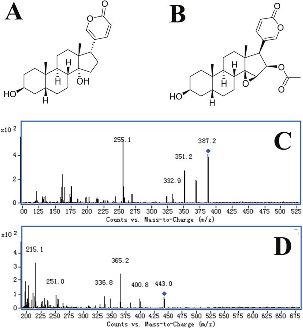 Figure 1: The chemical structure and product ion of Bufalin and Cinobufagin. (A) Chemical structure of Bufalin; (B) chemical structure of Cinobufagin; (C) product ion of Bufalin; (D) product ion of Cinobufagin.