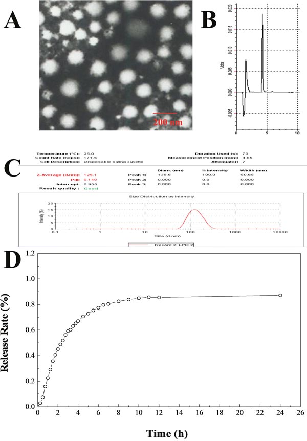 Figure 2: Characterization and physicochemical properties of Bufalin-BSA-NP. (A) The transmission electron microscope photograph of Bufalin-BSA-NP; (B) HPLC results of Bufalin-BSA-NP; (C) size distribution by intensity of Bufalin-BSA-NP; (D) release curve of Bufalin-BSA-NP in vitro.