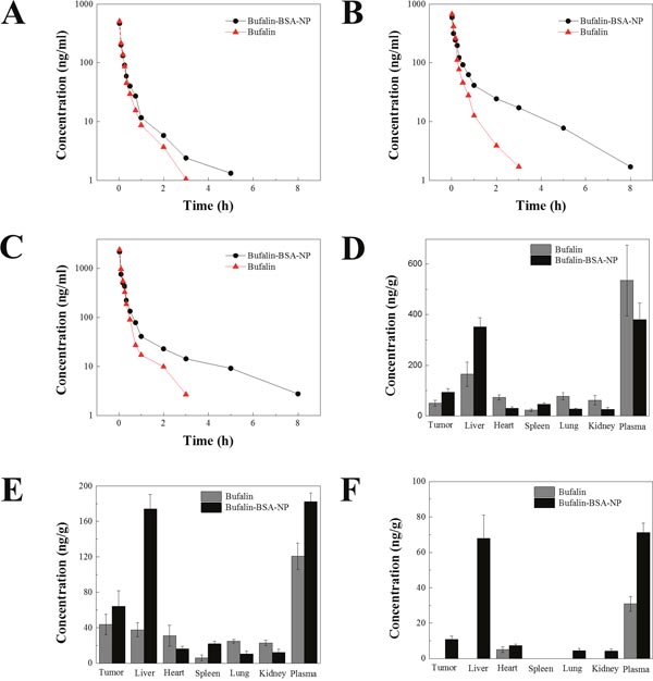 Compared with Bufalin solution, Bufalin-BSA-NP showed higher AUC value and a prolonged residence of drug in blood circulation. Moreover, higher drug concentration and longer residence time of Bufalin in liver demonstrated that Bufalin-BSA-NP could directly target to liver and reduce the side effects of Bufalin to other organs.