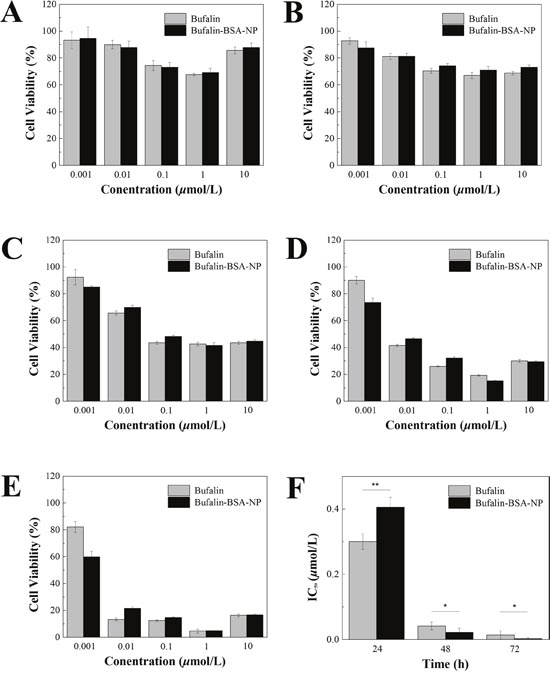 Figure 5: Bufalin-BSA-NP demonstrated similar anti-tumor effects to Bufalin in vitro. (A) The cell viability after sustained action of 6 h; (B) the cell viability after sustained action of 12 h; (C) the cell viability after sustained action of 24 h; (D) the cell viability after sustained action of 48 h; (E) the cell viability after sustained action of 72 h; (F) half inhibitory concentration (IC50) of Bufalin-BSA-NP. Values are expressed as mean ± standard error of mean; n = 5. *P < 0.05; ** P < 0.01.