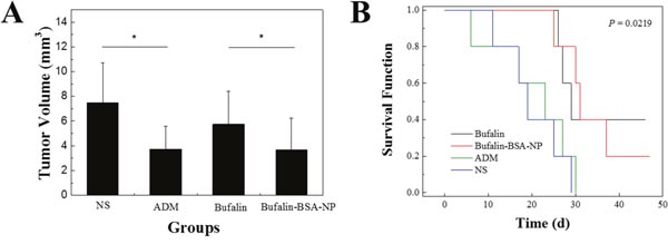 Figure 6: Bufalin-BSA-NP demonstrated more potent anti-tumor effects than Bufalin on hepatocellular carcinoma in nude mice. (A) Tumor volume of different groups; (B) survival analysis of different groups. ADM: adriamycin; NS: normal saline. Values are expressed as mean ± standard error of mean; n = 10. *P < 0.05.