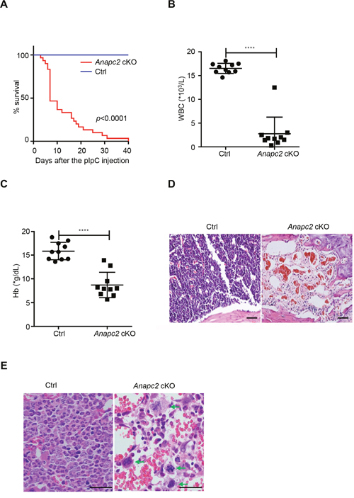 Figure 2: The Anapc2 deletion resulted in BM failure. (A) Survival curve of Anapc2 cKO and Anapc2flox/flox mice (Ctrl) after the pIpC injection (n=30). Most Anapc2 cKO mice died within 40 days. (B and C) Peripheral white blood cell (WBC) and hemoglobin (Hb) counts of Anapc2 cKO mice significantly decreased at day 5 after the pIpC injection. ****p<0.0001. (D) HE staining analysis of BM sections from the femur of Anapc2 cKO mice and control (Ctrl). After the pIpC injection, most nucleated cells disappeared in the BM. Scale bar represents 100 μm. (E) HE staining analysis of BM sections from the femur of Anapc2 cKO mice and control (Ctrl). An increase of mitotic cells which were arrested in a metaphase-like state (green arrow) was observed in the bone marrow before the disappearance of hematopoietic cells. Scale bar represents 100 μm.