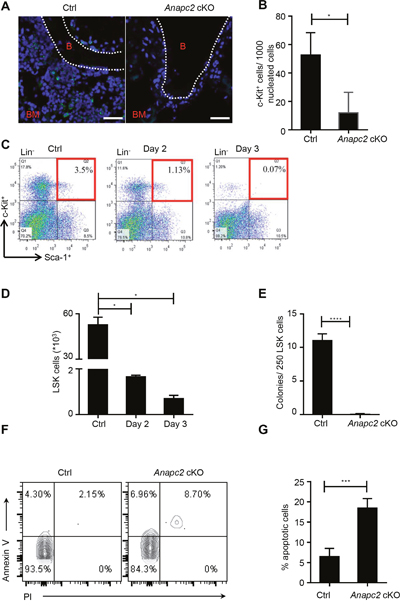 Figure 3: Anapc2 is required for the maintenance of HSPCs. (A and B) The c-Kit+ cells from the femur of Anapc2 cKO mice significantly decreased at day 5 after the pIpC injection by using IF staining. c-Kit staining (green), DAPI (blue), B (bone), BM (bone marrow), n=5, scale bar represents 100 μm, * p<0.05. (C) Flow cytometric analysis of LSK (Lin−Sca-1+c-Kit+) cells from Anapc2 cKO mice at day 2 and day 3 post-pIpC injection showed LSK cells significantly decreased. (D) Absolute number of LSK cells were calculated based on the proportion obtained in Fig. C. n=5, *p<0.01. (E) The colony-formation cell (CFC) assay demonstrated that the LSK cells obtained from day 2 post-pIpC injection could hardly generate any colony, n=5, ****p<0.0001. (F and G) The proportion of Annexin V+ LSK cells were significantly increased at day 1-3 after the pIpC injection, n=9, ****p<0.0001.