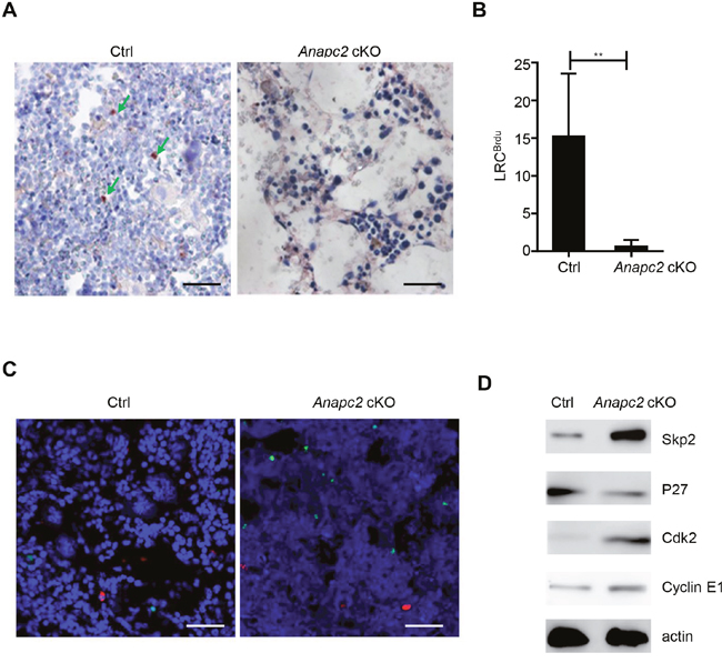Figure 4: Anapc2 is required for the maintenance of d-HSCs. (A and B) The LRCBrdU (green arrow) from femur sections of Anapc2 cKO mice could be hardly detected by IHC staining after the pIpC injection, n=6, ** p<0.01. LRCBrdU, BrdU label-retaining cells; Ctrl, control. (C) None of LRCBrdU showed TUNEL positive in both of Anapc2 cKO mice and control (Ctrl) at day 2 after the pIpC injection, n=6, Anapc2 flox/flox mice as control. LRCBrdU staining (red), TUNEL staining (green), DAPI (blue). Scale bar represents 100 μm. (D) Western blot analysis to detect the expression of p27, Skp2, and Cdk2 and cyclin E using BM cells at day 3 post-pIpC injection and Anapc2flox/flox mice as control (Ctrl).