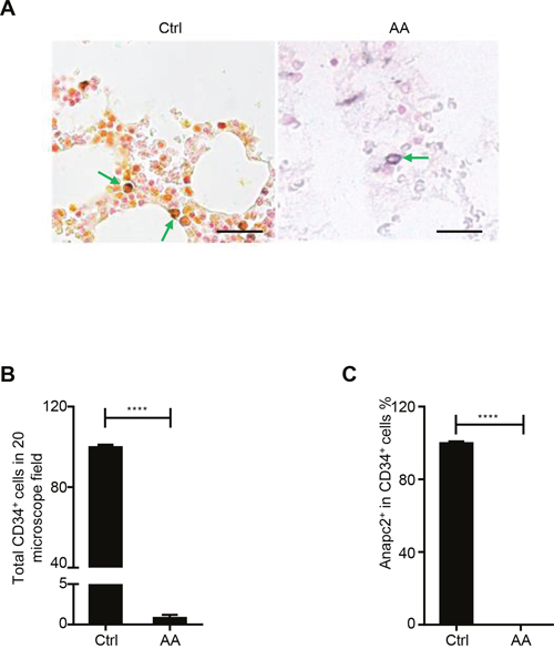 Figure 5: Anapc2 was absent in the HSPCs in the AA’s BM. (A-C) Anapc2 could not be detected in the BM CD34+ cells of AA by bi-color IHC staining. In normal control (Ctrl), Anapc2 (expressed in nuclear, golden in color) could be detected in the BM CD34+ (expressed in membrane, blue in color) cells by bi-color IHC staining (green arrow) whereas it could not in AA’s (green arrow). n=3 (Ctrl), 20 (AA), scale bar represents 100 μm, ****p<0.0001.