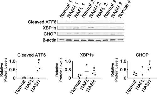 Figure 1: Expression of ER stress-associated transcription factors in NASH, NAFL and normal liver tissues. β-Actin was used as an internal control. Horizontal lines represent means of densitometry signals from the western blot analyses for all tissue groups. #, significant differences in signals between NASH and normal liver tissues (P < 0.05). Data for NAFL tissues were not used for statistical comparisons because of limited sample number (n = 2).