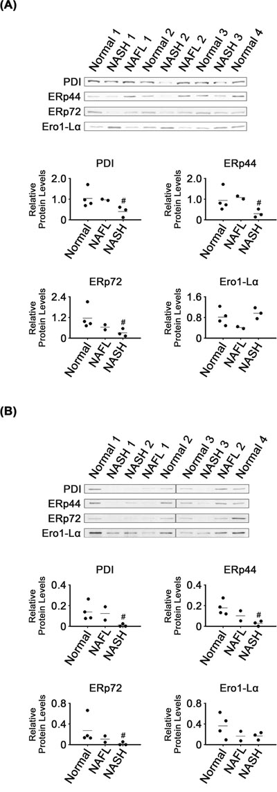 Figure 3: Expression of ER-related foldases in NASH, NAFL and normal liver tissues (A) and in their microsomes (B). β-Actin was used as an internal control for the whole tissue samples, as described for Figure 1. Horizontal lines represent means of densitometry signals from the western blot analyses. #, significant differences in signals between NASH and normal liver tissues or microsomes (P < 0.05). Data for NAFL tissues were not used for statistical comparisons because of limited sample number (n = 2).