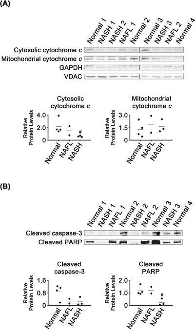 Figure 4: Expression of apoptosis marker proteins in NASH, NAFL and normal liver tissues (A and B). Glyceraldeyde-3-phosphate dehydrogease (GAPDH) and voltage-dependent anion-selective channel (VDAC) were used as internal controls for cytosolic and mitochondrial samples, respectively (A). β-Actin was used as an internal control for the whole tissue samples (B), as described for Figure 1. Horizontal lines represent means of densitometry signals from western blot analyses. #, significant differences in signals between NASH and normal liver tissues (P < 0.05). Data for NAFL tissues were not used for statistical comparisons because of limited sample number (n = 2).