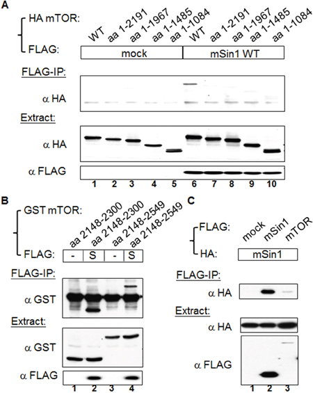 Figure 1: mSin1 binds to the kinase domain of mTOR. (A) HEK 293T cells were co-transfected with indicated FLAG/FLAG-mSin1 and HA-mTOR plasmids (full length, aa 1-2191, 1-1967, 1-1485, and 1-1084). The expressed proteins from the lysate were subjected to FLAG antibody IP. (B) HEK 293T cells were co-expressed with FLAG-mSin1 wild-type (S) and GST-mTOR fusion proteins (aa 2148-2300 and aa 2148-2549). The cells were lysed and the supernatants were performed FLAG antibody IP. (C) HEK 293T cells were co-transfected with indicated FLAG/FLAG-mSin1/FLAG-mTOR and HA tagged mSin1. The expressed proteins from the lysate were subjected to FLAG antibody IP and Western blot analysis. Anti-FLAG, anti-HA, or anti-GST antibodies were used to detect appropriate proteins in the total lysates, the IP samples, and pull-down samples. The blots are representative of one experiment repeated twice.