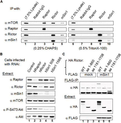 Figure 2: mSin1 forms a stable complex with Rictor independent of mTOR and binds to the carboxyl terminus of Rictor. (A) HEK 293T cells were lysed in buffer containing 0.25% CHAPS (left panels) or 0.5% Triton X-100 (right panels). Antibodies against mTORC1 or mTORC2 were used to perform IP or reciprocal IP. (B) Viral particles containing Raptor, Rictor or two types of mSin1 RNAi were used to infect HEK 293T cells. Cells infected with luciferase RNAi were included as a control. The lysates were processed by Western blot analysis to detect the various proteins, Akt abundance and the phosphorylation of Akt S473 (P-S473 Akt). (C) HEK 293T cells were co-transfected with the indicated FLAG/FLAG-mSin1 and HA tagged Rictor plasmids (full length, aa 1-860 and 1181-1708). The expressed proteins were subjected to FLAG antibody IP. Anti-FLAG and anti-HA antibodies were used to detect the appropriate proteins in the total lysates and in the IP samples. The blots are representative of one experiment repeated twice.