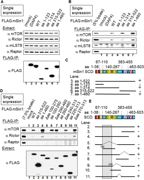 Figure 3: mSin1 aa 100-260 binds to mTOR/Rictor. (A) and (B) HEK 293T cells were individually transfected with various forms of FLAG-mSin1 (aa 1-123, 1-314, 315-522, 1-460, and wild-type). The expressed proteins from the lysate were subjected to FLAG antibody IP. Anti-mTOR, Rictor, mLST8, and Raptor antibodies were used to assess/detect the appropriate protein levels in the total lysates and in the IP samples. Both FLAG only (mock) and FLAG tagged death associated protein 4 (FLAG-DAP4) were included as negative controls. (C) The binding between the various fragments of mSin1 and the different endogenous proteins is summarized. The recovery of the mTOR/Rictor/mLST8 together with mSin1 fragments including different Sin1 conserved domains (SCD) is indicated on the right as either + or -. (D) After more experiments of trials and errors, HEK 293T cells were individually transfected with the indicated FLAG-mSin1 WT or FLAG-mSin1 fragments. The expressed proteins from the lysate were subjected to FLAG antibody IP and Western blot analysis. Indicated antibodies were used to detect the appropriate associated proteins in the total lysate and in the IP. (E) The recovery of endogenous mTOR with the fragments of mSin1 is summarized and indicated on the right as either + or -. The blots are representative of one experiment repeated twice.