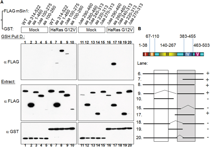 Figure 5: HaRas G12V binds to mSin1 aa 260-460, a region that is different to the one involved in mTORC2 binding. (A) HEK 293T cells were co-transfected with GST/GST-HaRas G12V and the various indicated FLAG-mSin1 fragments. A portion of each extract was used to examine the expression level of the GST and FLAG tagged proteins. The majority of each lysate was subjected to GSH pull down. Anti-FLAG antibody was used to detect the associated proteins after the pull-down. (B) The binding between fragments of mSin1 and the recombinant HaRas G12V proteins is summarized here. The recovery of the HaRas G12V association is indicated on the right as either + or -. The blots are representative of one experiment repeated twice.