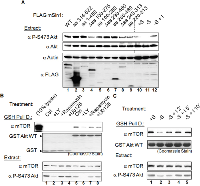Figure 7: The mSin1 aa 100-275, namely the binding sites for mTORC2 and Akt, is necessary for phosphorylation of Akt at the S473 site. The association between mTOR and Akt can be regulated by serum, insulin and the presence of a PI3K inhibitor. (A) HEK 293T cells were only transfected with the various indicated FLAG-mSin1 fragments. Cells were lysed in the lysis buffer containing 0.5% TritonX-100. Anti-phosphorylated Akt S473 antibody was used to detect the functioning of these mSin1 fragments. The last three lanes (lane 10, 11, and 12) were cells treated with normal serum (+S), serum withdrawal (-S), or insulin stimulation after serum withdrawal (-S+I) and the Akt signaling changes were used as the antibodies efficacy controls. (B) HEK 293T cells were transfected with either GST or GST Akt. Twenty-four hours after transfection, the cells from the master culture were split into individual plates so that the starting material was the same. Sixteen hours after the split and before the cells were harvested, the cells were treated with vehicle DMSO, 20 μM LY294002, 1 μM rapamycin, or 10 μM U0126 for 1 h. (C) HEK 293T cells were transfected with GST Akt. Twenty-four hours after transfection, the cells from master culture were split into individual plates so that the starting material was the same. The cells were then either continuously cultivated in medium containing serum (+S) or in serum depletion medium (-S), both for an additional 16 h. Immediately before harvesting these groups of cells, insulin 1 μM was added into the medium for an additional 2, 5, or 10 min. After processing by GST pulling down and Western blot analysis, antibodies such as anti-GST, mTOR, and phosphorylated S473 Akt were used to detect the signal. The blots are representative of one experiment repeated twice