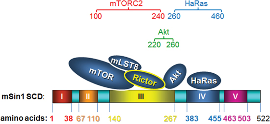 Figure 8: A cartoon schematically presenting how mSin1 associates with its various partners. It is the kinase domain of mTOR, the carboxyl terminus of Rictor, and the pleckstrin homology domain of Akt that bind to mSin1. Based on these findings in terms of association between the various proteins and the various fragments of mSin1, we suggest that mTORC2, Akt, and HaRas, respectively, associate with mSin1 aa 100-240, mSin1 aa 220-260, and mSin1 aa 260-460.
