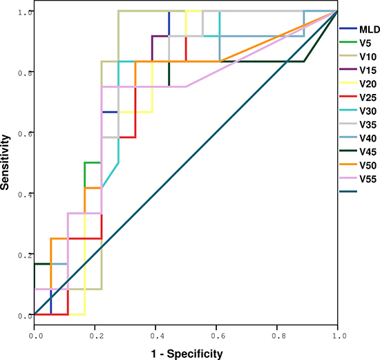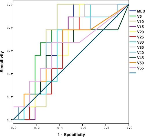 Figure 3: ROC analysis of various dosimetric factors with symptomatic RIPE. Definition of abbreviations: ROC = receiver operating characteristic curves; RIPE = radiation-induced pleural effusion.