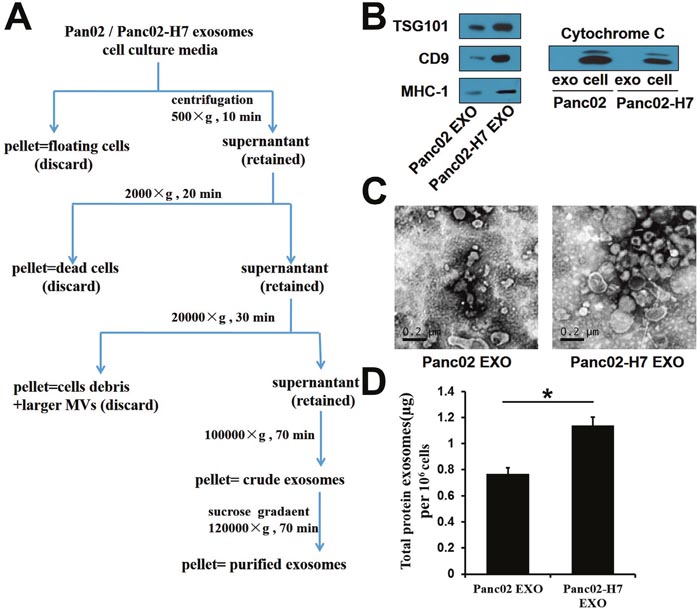 Figure 1: Characterization of Panc02- and Panc02-H7-derived exosomes. Exosome isolation and purification schematic. (A) Common exosome markers, including TSG101, CD9, and MHC-I, were detected in two exosomes. (B) Cytochrome c was detectable in two whole-cell lysates, but not in exosomes. Panc02 EXOs and Panc02-H7 EXOs were negatively stained with 3%phosphotungstic acid and viewed by TEM (scale bar=200 nm). (C) Total protein per million cells in two exosomes. (D) Panc02-H7EXOs expressed more total protein than Panc02 EXOs.(*P<0.05).