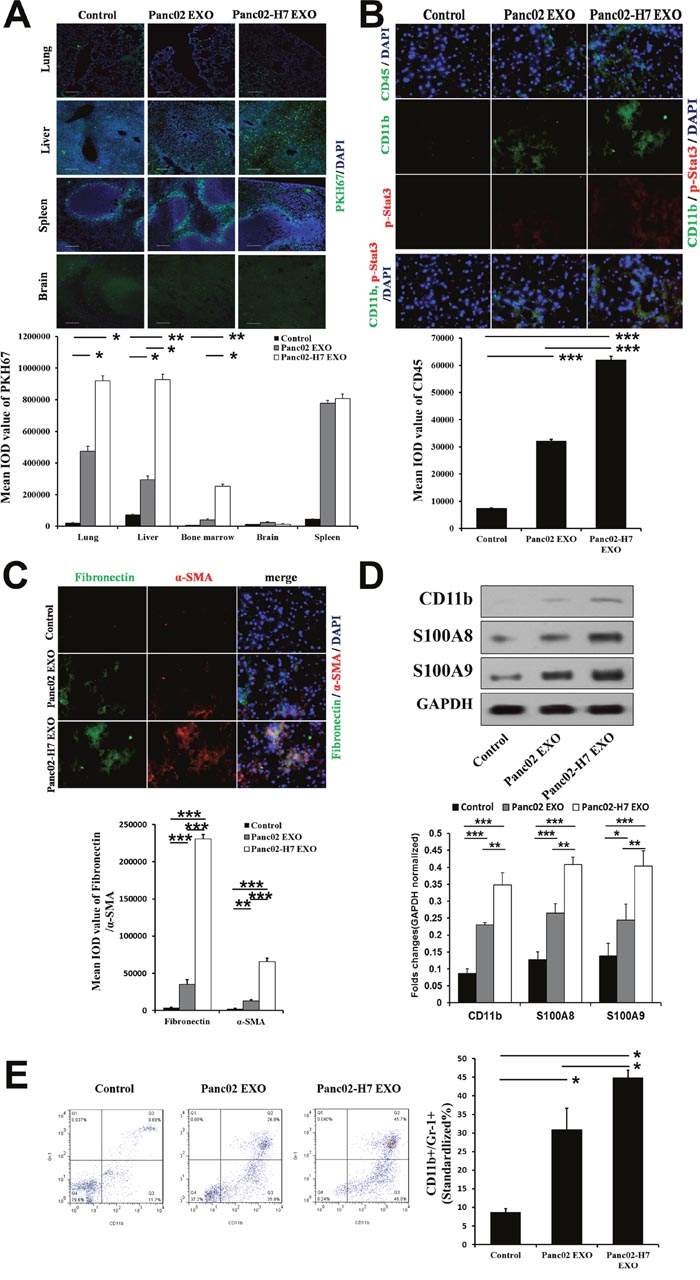 Figure 3: Pancreatic cancer-derived exosomes mediate liver pre-metastatic niche formation. Confocal microscopy (lung, liver, spleen, brain) of PKH67-labeled Panc02 EXO and Panc02-H7 EXO tissue distribution (green) 24 hpi. (A) PKH-67-labeled liposomes served as controls (scale bar=100 μm). Histogram shows exosome tissue distribution quantification (n=5/group). CD45, p-Stat3, and CD11b IF staining in liver sections from controls (left) and mice treated with Panc02 EXOs(middle) or Panc02-H7 EXOs (right) for 12 d without tumor challenge. (B) Histogram shows infiltrating CD45+ cell quantification. FN and α-SMA IF staining in liver sections from controls (top) and mice treated with Panc02 EXOs(middle) or Panc02-H7 EXOs (bottom) for 12 d without tumor challenge. (C) Histogram shows infiltrating α-SMA+hStCs and FN expression quantification(400× magnification; n=5/group). Western blotting analysis showed upregulated S100A8 and S100A9 in livers treated with Panc02-H7-derived exosomes. Histogram shows expression of the three proteins in three groupsas determined by densitometric analysis (n=3/group). (D) Pancreatic cancer-derived exosomes induce MDSC accumulation in peripheral blood. (E) Representative flow cytometric plots (left) and quantification (right) of CD11b+GR1+ MDSCs (n=5/group). *P<0.05, **P<0.01,***P<0.001.