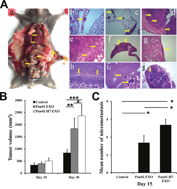 Figure 4: Pancreatic cancer-derived exosomes promote tumor growth and metastasis. Representative macro-anatomy and H&E-stained images of Panc02-H7 EXO-treated mice 30 d post-SOI. (A) A yellow star marks primary tumor locations; arrows indicate metastatic sites in the peritoneal cavity (Aa). Arrows showing lung micrometastasis (Ab), pleura metastasis (Ac), tumor invasion of the diaphragm (Ad), metastasis to spleen (Ae), tumor invasion of the adrenal gland (Af), metastasis to the kidney (Ag), tumor invasion of the small intestine (Ah), micrometastasis of the liver(lower right shows enlarged image) (Ai), and metastasis to lymph nodes (Aj) (magnification, 100×). Primary tumor volume in mice treated with PBS, Panc02 EXOs, orPanc02-H7 EXOs at 15 and 30 d post-SOI (B). Number of micrometastases in mice treated with PBS, Panc02 EXOs, or Panc02-H7 EXOsat 15d post-SOI (n=6/group) (C). *P<0.05, **P<0.01,***P<0.001.