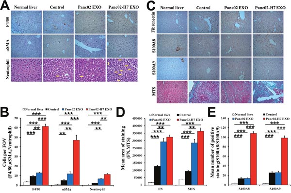 S100A8 and S100A9 were upregulated, and F4/80+ macrophages, α-SMA+hStCs, and neutrophils were increased in Panc02-H7 EXO-treated mouse livers compared with untreated, Panc02 EXO-, or PBS-treated livers (Figure 5A–5B & 5C–5E). There was no difference between the Panc02 EXO and control groups. Immunohistochemical (IHC) analyses and Masson's trichrome staining showed that FN was upregulated in Panc02-H7 EXO-treated mouse livers. Connective tissue deposition was increased in mouse livers treated with either type of exosome compared with control and normal liver, with no difference between the two exosomes (Figure 5C–5D). These data suggest that pancreatic cancer-derived exosomes may reprogram the liver to form liver metastatic niches.