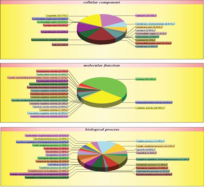 Protein functional annotations were conducted using Blast2GO against the non-redundant protein database (NR;NCBI). The KEGG database (http://www.genome.jp/kegg/) was used to classify and group these identified proteins. Gene Ontology (GO) is an international standardization of gene function classification system. It provides a dynamically-updated, controlled vocabulary to describe gene and gene product attributes in the organism. GO ontologies describe molecular function, cellular component, and biological process. KEGG PATHWAY is a collection of manually drawn pathway maps representing molecular interaction and reaction networks.