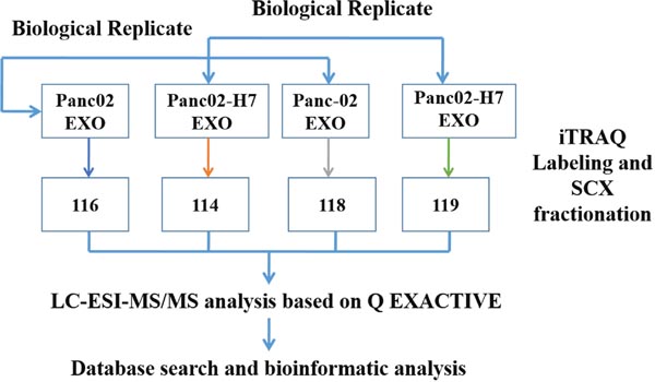 Protein (100μg) from each exosome sample was digested with Trypsin Gold (Promega, Madison, WI, USA) at a 30:1 protein:trypsin ratio, at 37°C for 16 h, and then dried by vacuum centrifugation. Peptides werereconstituted in 0.5 M TEAB and processed according to the manufacturer’s protocol for 4-plex iTRAQ reagent.Briefly, one unit of iTRAQ reagent was thawed and reconstituted in 24 μl isopropanol. Samples were labeled with iTRAQ tags as follows: Panc02 EXO and Panc02-H7 EXO were labeled with iTRAQ tags, 116 and 114, respectively, and biological replicates of the same exosomes were labeled with iTRAQ tags, 118 and 119, respectively. Peptides were labeled with the isobaric tags, incubated at room temperature for 2h, and then pooled and dried by vacuum centrifugation. Strong cation exchange (SCX) chromatography was performed with a LC-20AB HPLC pump system (Shimadzu, Kyoto, Japan). iTRAQ-labeled peptide mixtures were reconstituted with 4 ml buffer A (25 mM NaH2PO4 in 25% ACN, pH 2.7) and loaded onto a 4.6×250 mm Ultremex SCX column containing 5 μm particles. Peptides were eluted at a flow rate of 1 ml/min with a gradient of buffer A for 10 min, 5–60% buffer B (25mM NaH2PO4, 1 M KCl in 25% ACN, pH 2.7) for 27 min, and 60–100% buffer B for 1 min. The system was then maintained at 100% buffer B for 1 min before equilibrating with buffer A for 10 min prior to the next injection. Elution was monitored by measuring the absorbance at 214 nm, and fractions were collected every 1 min. Eluted peptides were pooled into 20 fractions, de-salted with a Strata X C18 column (Phenomenex), and vacuum-dried. The iTRAQ workflow is shown in (Figure 9).