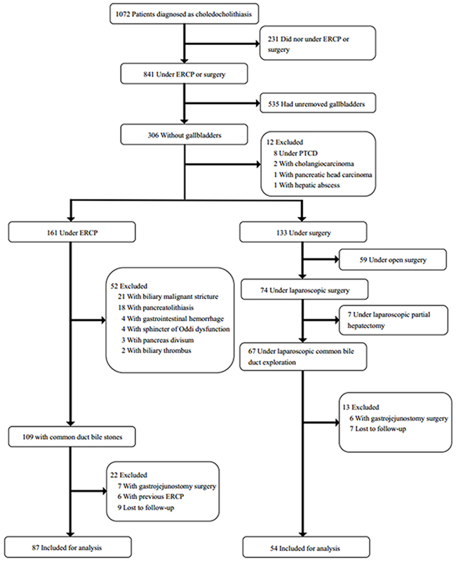 A retrospective study was conducted including all consecutive patients who presented with CBD stones between October 2012 and February 2015 from our single hospital in China. Data were collected from the patients’ medical records. Patients were included for analysis when they met the following criteria: (1) CBD stones confirmed by Magnetic resonance cholangiopancreatography (MRCP), computed tomography (CT) and/or abdominal ultrasonography; (2) Medical history of cholecystectomy. The exclusion criteria was: (1) no ERCP or surgery in this course; (2) unremoved gallbladders;(3) pancreatolithiasis, sphincter of Oddi dysfunction (SOD), pancreas divisum, biliary thrombus or gastrointestinal hemorrhage; (4) other pancreatic or biliary malignant diseases; (5) open surgery; (6) partial hepatectomy at the same time; (7) history of LCBDE or ERCP for recurrent CBD stones; (8) history of biliary diversion, Billroth II surgery or Roux-en-Y surgery.