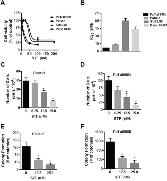 Figure 1: STF-118804 decreases pancreatic cancer cell survival and growth. (A and B) PDAC (PaTu8988t, Panc-1, Su86.86, Panc04.03) were treated with vehicle (control) or different concentrations of the NAMPT inhibitor STF-118804 and submitted to MTT analysis 72 hours after treatment. IC50 is expressed in panel B. (C and D) Panc-1 and PaTu8988t cells were treated with vehicle (control) or STF-118804 for 72h and cells were counted by Trypan blue dye exclusion assay. (E and F) Panc-1 and PaTu8988t cells were grown in soft agar containing vehicle or different concentrations of STF-118804 for 14 days. Graph shows quantitative analysis of colony number. Values are mean ± SEM of at least three independent experiments performed at least in triplicate. * indicates p< 0.05.