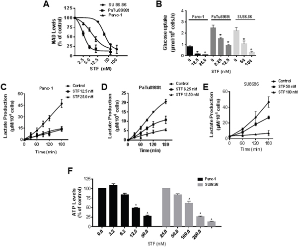 Many cancer cells rely on high glycolytic flux, even when regular oxygen concentration is available, the so-called Warburg effect [20]. As NAD is important to the glycolytic pathway, we determined the effect of STF on glucose consumption and lactate production in sensitive cells and also in the less sensitive SU86.86 cell line. STF reduced the uptake of glucose (Figure 2B) and the release of lactate (Figure 2C-2E) in the cell media for all cell lines tested. STF caused a concentration-dependent decrease in ATP levels of Panc-1 and also more resistant cell line SU86.86 (Figure 2F). These results altogether show that STF treatment decreases glucose energy metabolism and ATP levels, and leads to metabolic collapse in PDAC.