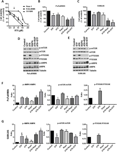 To evaluate the role of AMPK on the effect of STF, we treated both sensitive and less sensitive cell lines with A769662 (shown A76 from here on), a highly specific AMPK activator. A76 reduced the cell viability of all cell lines tested, and SU86.86 was more resistant to its effect on cell viability (Figure 4A). As STF leads to both an activation of AMPK by phosphorylation and a decrease in phosphorylation of P70S6K, a downstream effector of mTOR, we tested the effect of A76 on phosphorylation of these proteins as well as its combination with STF and Rapamycin (Rapa) (Figure 4B-4G). Treatment with A76 leads to an increased phosphorylation of AMPK in both sensitive and non-sensitive PDAC. However, unlike STF, A76 did not decrease the phosphorylation state of P70S6K. For this reason, we tested the combination of A76 with both STF and Rapamycin and evaluated the effect on both cell viability and the phosphorylation ratio of proteins. Combination of both STF and Rapamycin with A76 lead to a decrease in cell viability that was more pronounced than each compound alone. This decrease on viability was more evident in the less sensitive cell line SU86.86 and was preceded by an increase in phosphorylation of AMPK and a complete dephosphorylation of P70S6K in both cell lines. These results suggest that both phosphorylation of AMPK and dephosphorylation of P70S6K may contribute to the loss of cell viability induced by STF.
