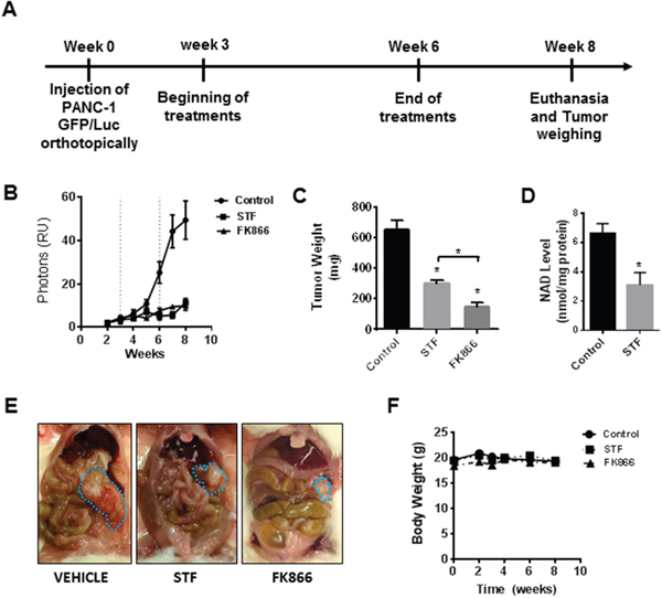 Figure 6: STF-118804 and FK866 are effective in suppress pancreatic tumor growth in vivo in an orthotopic model. (A) Schematic representation of the treatment. (B) Tumor growth in vivo was assessed by luminescence measurements. Mice were orthotopically injected with Panc-1-GFP/Luciferase cells and randomized into three groups: vehicle (n=10), STF-118804 25 mg/kg (n=10), and FK866 15 mg/kg (n=10). Mice were treated for 3 consecutive weeks and tumor growth was followed for two more weeks without any treatment. (C) Tumor weight after treatments. (D) NAD Levels in tumors from mice treated with both vehicle and STF 25 mg/kg (E) Picture of orthotopic tumors at the end of the experiment. (F) Body weight of mice measured during the experiment. Values are mean ± SEM. * indicates p< 0.05 compared to control group.