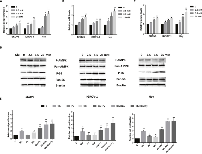 Figure 1: Glucose and glutamine are two major nutrients for cell proliferation in ovarian cancer cells. The ovarian cancer cell lines SKOV3, IGROV-1 and Hey were treated in glucose free media supplemented with various concentrations of glucose (0, 2.5, 5.5, and 25 mM) for 48 hours. Cell proliferation was assessed by MTT assay. Glucose promoted cell proliferation (A), increased ATP (B) and lactate production (C) in all three cell lines. The expression of phosphorylation of p-AMPK and p-S6 in SKOV3, IGROV-1 and Hey cells was detected by Western blotting after treatment with glucose for 24 hours (D). The three cell lines were grown for 48 hours in media lacking glucose, glutamine or pyruvate supplemented with glucose (5.5 mM), glutamine (4.0 mM) or pyruvate (5.0 mM), respectively, or a combination of these as indicated (E). The combination of glucose, glutamine and pyruvate caused maximal cell proliferation. The results are shown as the mean ± SEM of triplicate samples (*P<0.05, **p < 0.01) and are representative of three independent experiments.