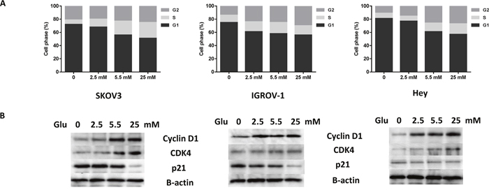 Figure 3: Glucose affects cell cycle progression in ovarian cancer cells. The SKOV3, IGROV-1, and Hey cells were treated in glucose-free media supplemented with various concentrations of glucose (0, 2.5, 5.5, and 25 mM) for 36 hours. Cell cycle analysis was performed using Cellometer assay (A). The effects of glucose on cyclin D1, CDK4 and p21 were examined by Western blot after exposure to glucose for 24 hours at the indicated concentrations (B). Data are representative of three independent experiments.