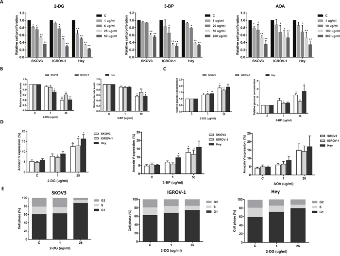 Figure 4: The effect of 2-DG, 3-BP and AOA on cell growth in ovarian cancer cells. The SKOV3, IGROV-1, and Hey cells were treated with 2-DG, 3-BP and AOA for 48 hours as indicated. Cell proliferation was assessed by MTT assay. 2-DG, 3-BP and AOA reduced cell proliferation in a dose dependent manner (A). 2-DG and 3-BP reduced lactate production and glucose consumptions in the media after 24 hours of treatment (B and C). 2-DG, 3-BP and AOA increased the expression of Annexin V after 18 hours of treatment (D). 2-DG induced cell cycle G1 arrest in all three cell lines (E). Data are shown as the mean ± SEM of triplicate samples and are representative of three independent experiments.