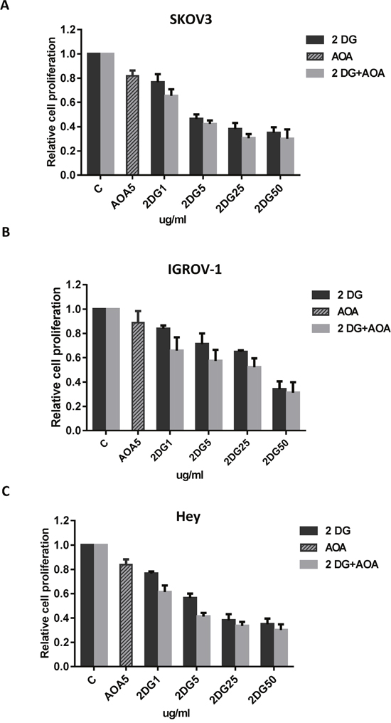 Figure 5: AOA increased sensitivity to 2-DG in inhibition of cell proliferation. The SKOV3, IGROV-1, and Hey cells were cultured overnight and subsequently treated with AOA (5 ug/ml) alone and in combination with varying concentrations of 2-DG (1, 5, 25 and 50 ug/ml) for 72 hours. AOA synergistically enhanced anti-proliferative effect of 2-DG in ovarian cancer cells (A-C). Data are shown as the mean ± SEM of triplicate samples and are representative of three independent experiments.