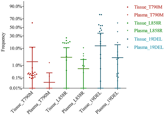 Figure 3: EGFR mutation frequency distribution of paired tumor tissue and plasma. gDNA and ctDNA were detected in the digital PCR platform, and the frequency of tumor tissue is shown as a dot symbol, while the frequency of plasma is shown as a triangle symbol. Mutation types are shown by different colors. The frequency of plasma was lower than that of tumor tissue, and plasma did not detect a few positive sites in tumor tissue.