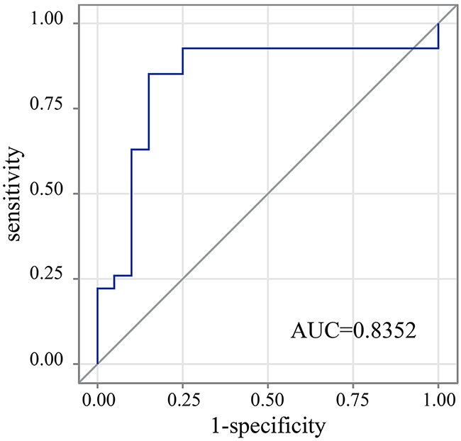 Figure 4: ROC analysis of plasma sample detection from tumor tissue mutation positive samples. The AUC value is 0.8352, which is significant, with a P value of 0.0091. The cut-off value = max (sensitivity + specificity -1). The figure also shows a maximum sensitivity and specificity of 85.19% and 85.00%, respectively.