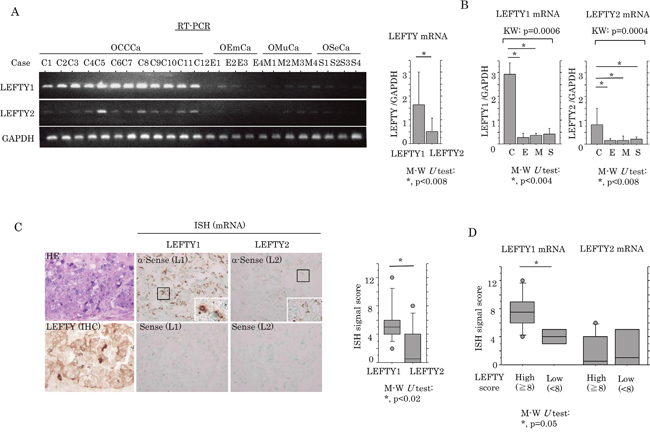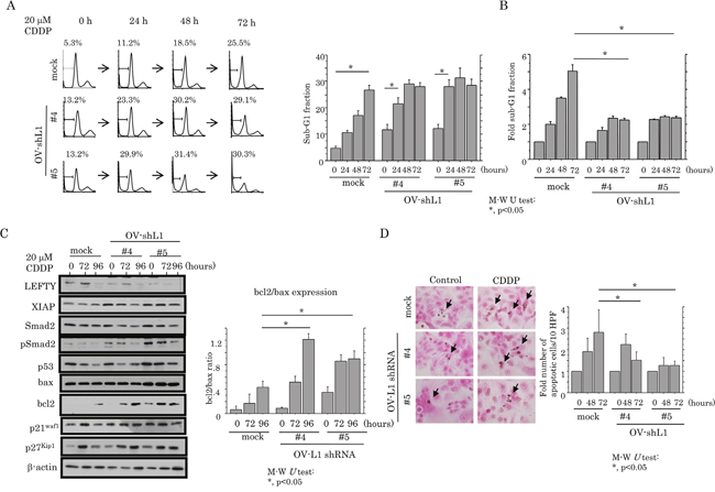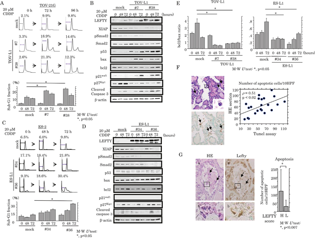 LEFTY, left-right determination factor; OECa, ovarian epithelial carcinoma; OCCCa, ovarian clear cell carcinoma; OSeCa, ovarian serous carcinoma; OEmCa, ovarian endometrioid carcinoma; OMuCa, ovarian mucinous carcinoma; FFPE, formalin-fixed and paraffin-embedded; XIAP, X-linked inhibitor of apoptosis protein; TGF-β, transforming growth factor β; CDDP, cisplatin; IHC, immunohistochemistry; ISH, in situ hybridization; TUNEL, TdT-mediated dUTP-biotin nick end labeling; LI, labeling index.