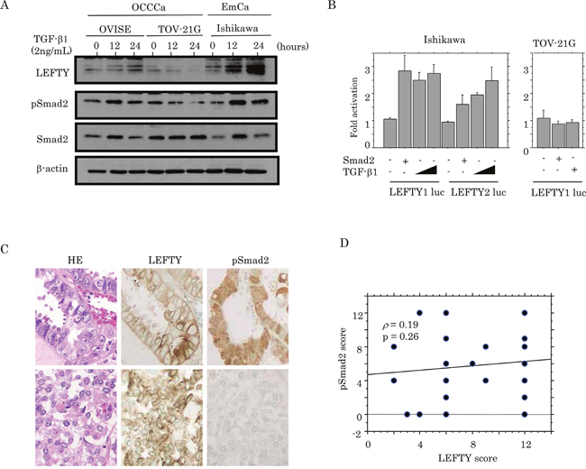 This study was conducted to clarify the distinguishing factors between OCCCa and other histological subtypes of OECa based on their protein signatures derived from shotgun proteomics. We found significant up-regulation of LEFTY expression at both the mRNA and protein levels in OCCCa tissues when compared with other histological subtypes of OECa. We further elucidated the function and regulation of LEFTY, and examined TGF-β1/Smad signaling and changes in cell kinetics in OCCCa cells.